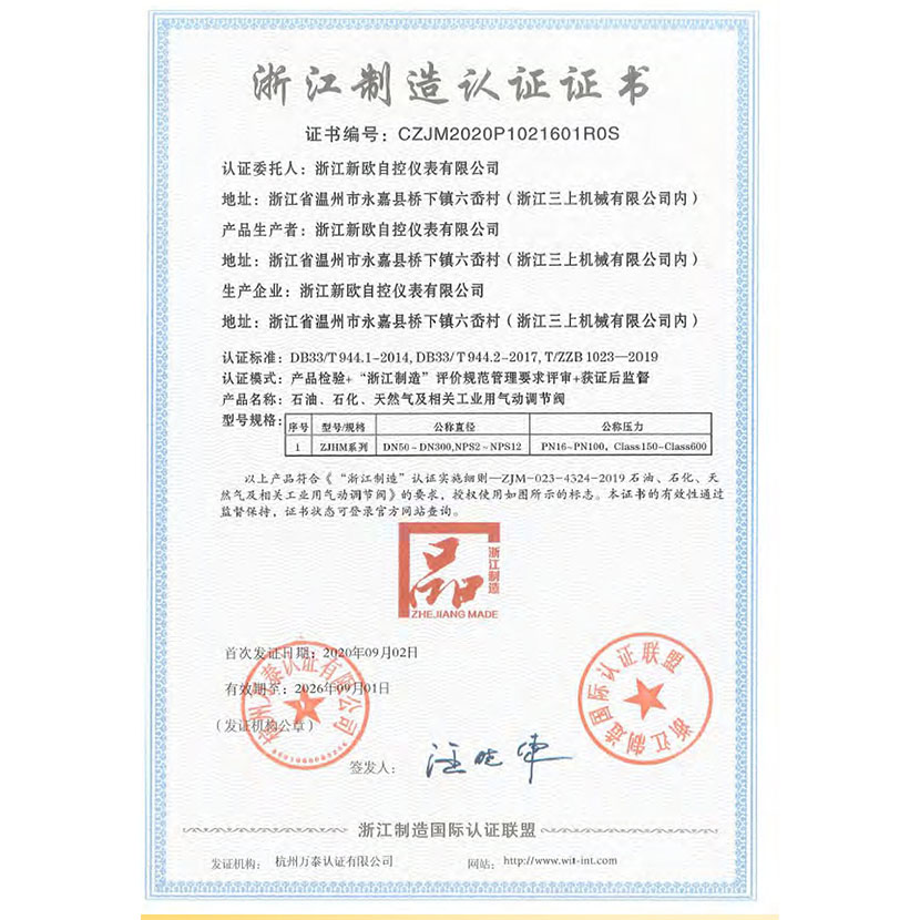 浙江制造認證證書